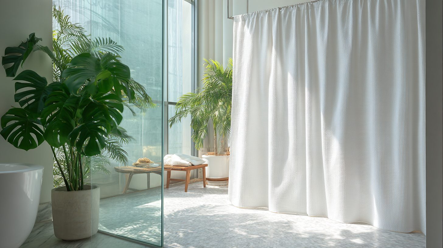 Our curtains feature a specialized water-repellent coating that beads water instantly, keeping your bathroom floor dry and safe. -